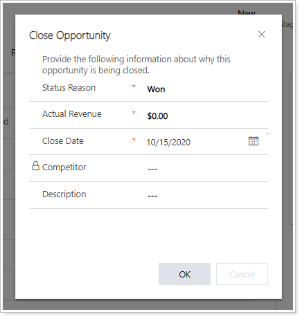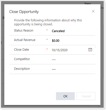 Field Name More Information Status Reason* This will default to Canceled when you close the opportunity as lost. Actual Revenue* This defaults to $0.00 when the opportunity is closed as lost. Close Date* Date you close the opportunity. Competitor This is not used by Tamarac CRM, any information in this field is not captured or searchable. Description This is not used by Tamarac CRM, any information in this field is not captured or searchable. Fields marked with an * are required.