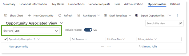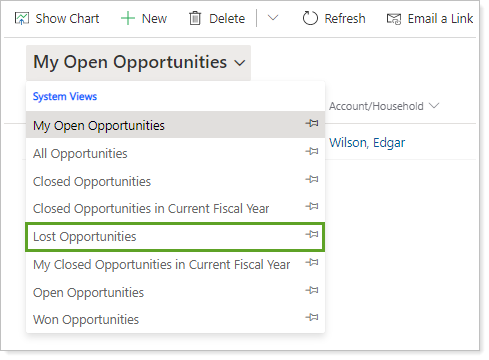 Click the current view and select Lost Opportunities. This will filter the page to only show lost opportunities.