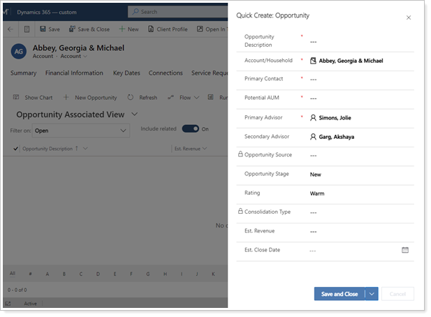 Field Name More Information Opportunity Description Description of the assets you are working to bring under management. Account/Household This will automatically populate for the account you selected to add the opportunity to. Primary Contact Person you're speaking to about the opportunity. This can be the primary contact for the account or another contact related to this account. Primary Advisor This defaults to the user creating the opportunity. Update this field to the appropriate person if you are creating the opportunity for another user. Secondary Advisor Enter the Secondary advisor for the opportunity. This defaults to the Secondary Advisor specified in the Account record, if any. Opportunity Source How you heard about this opportunity. Opportunity Stage Choose the most appropriate value from the list. Rating Choose the most appropriate value from the list. Potential AUM Assets you are working to bring under management for this opportunity. Est. Revenue Estimate of revenue when this opportunity is closed. Consolidation Type Type of asset you're trying to consolidate with the opportunity – for example, outside 401k. Est. Close Date Date you anticipate closing the opportunity.
