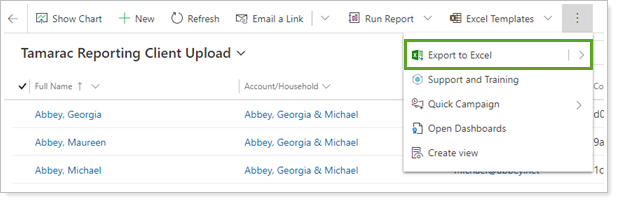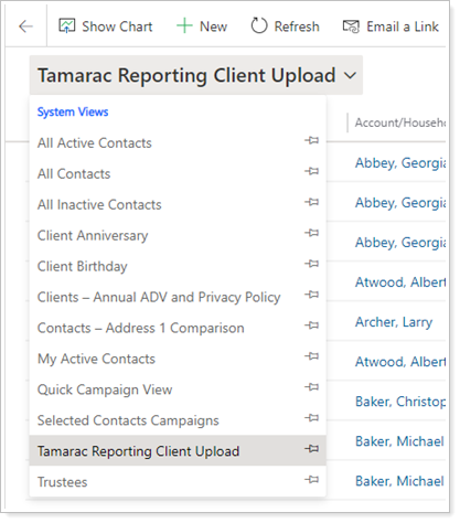 On the Contacts page, select the Tamarac Reporting Client Upload view.