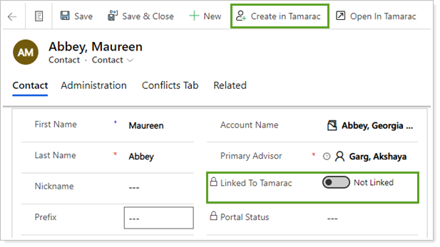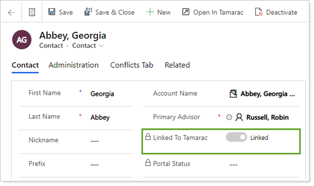 On the contact record, you can identify a linked contact using the Linked to Tamarac field. This field will show as Not Linked for any contact that has not been linked to Advisor View and the Create in Tamarac button will be visible.