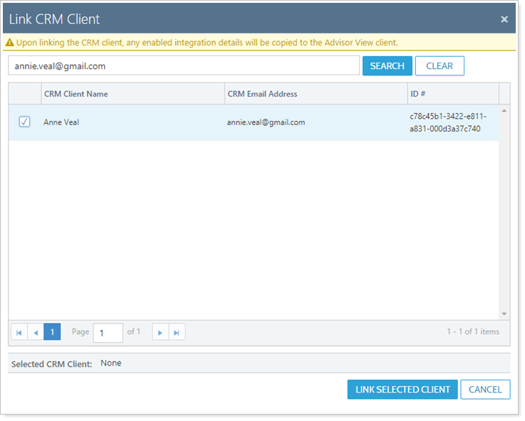 If the Tamarac CRM contact email is different, type the name or email of the contact you want to sync. When you see it in the list, click the associated radio button and then click Link Selected Client. All integrated fields (Contact Name, email address, and date of birth) will then be synced to Advisor View from Tamarac CRM.