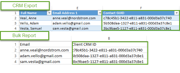 Copy and paste the GUID from the CRM export into the matching row in the Advisor View bulk report.