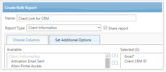 In Advisor View, create a Client Information bulk report. Include the following columns: