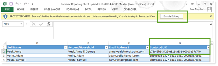 Columns A through C are hidden. You need only the Email Address and Contact GUID columns. Additional columns are included to help with the comparison to Advisor View data and can be deleted.