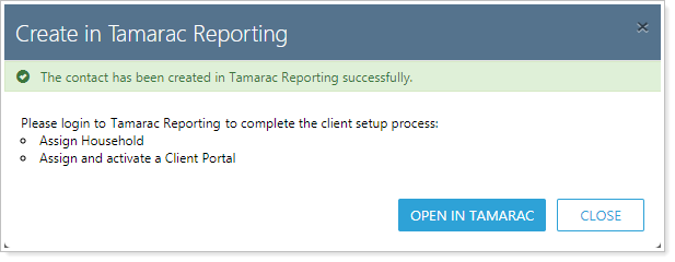 Using the Create in Tamarac button allows you to create and link clients in Advisor View with just one click. Use this button to create clients that are members of households that have already been linked. The Create in Tamarac button is used to create and link records in Advisor View one at a time. To link multiple records, refer to the Link Multiple Clients information.