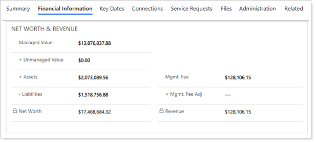 If you have enabled Household integration and your Households are linked with Advisor View, the values in the Net Worth & Revenue calculators will update daily following the sync with Advisor View. On the Household in Tamarac CRM, you will see the values for all financial accounts that belong to the Household in Advisor View.