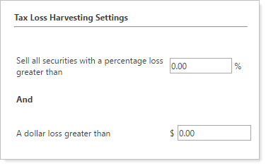The Tax Loss Harvesting Settings allow you to provide thresholds for tax loss harvesting rebalance activity. These thresholds tell Advisor Rebalancing the amount of loss you'll accept before selling that security in a tax loss harvesting rebalance.
