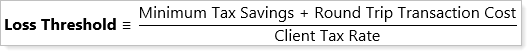 Loss threshold is generally arrived at based on the round trip cost, the minimum tax savings, and the client’s tax rate. You can use this calculation as a general rule of thumb to start with: