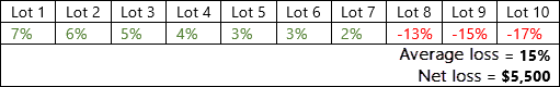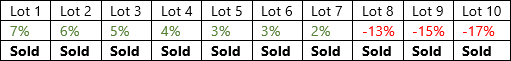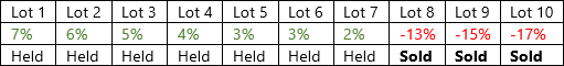 With the Sell only losses option selected, when you perform a Tax Loss Harvesting rebalance, only the three lots with losses will be sold. The losses on the individual lots do not need to meet the loss threshold, only the average of all losses for the security: