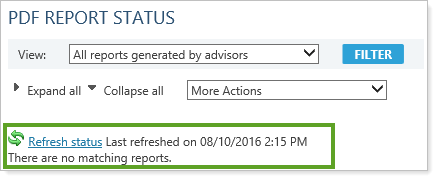 On the PDF Report Status page, Completed will appear in the Status column when Advisor View is finished generating the PDF reports. If you selected a large number of accounts, processing may take a few minutes. If Advisor View is not finished generating the report, Processing will appear in the Status column. To update the status of the report, click the Refresh Status link at the top of the page.