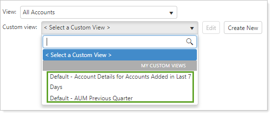 Default - *Account - Open | This Accounts page view displays the most common columns, and includes only open accounts. |