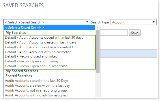 Default - Recon: Closed and Linked Status | This saved search identifies any account marked as closed but that is still included in the custodian feed. These accounts should be validated as either an open account or an account that needs to be removed from the custodian data feed. |